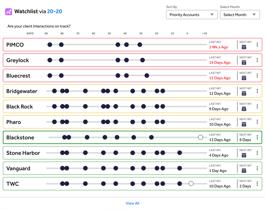 Visual heatmap-style alerts for clients with declining interaction frequency.