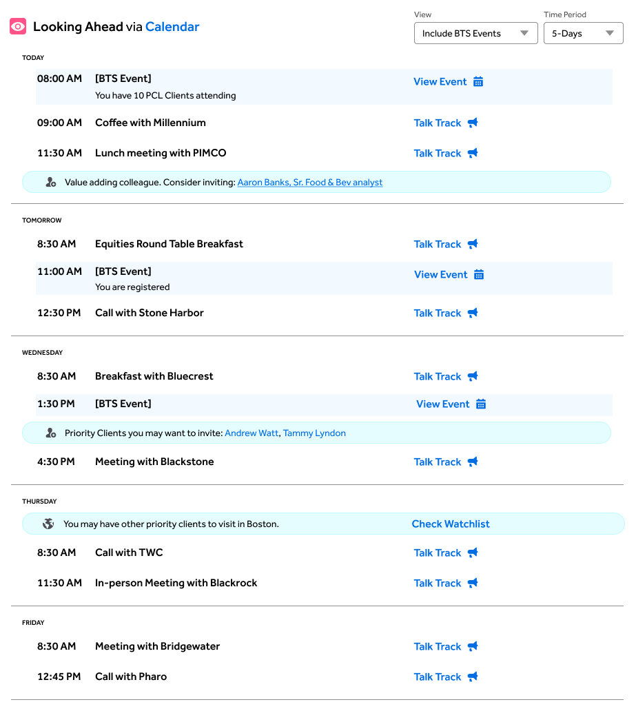AI-powered preview of upcoming meetings, recent client activity, and relevant news headlines.