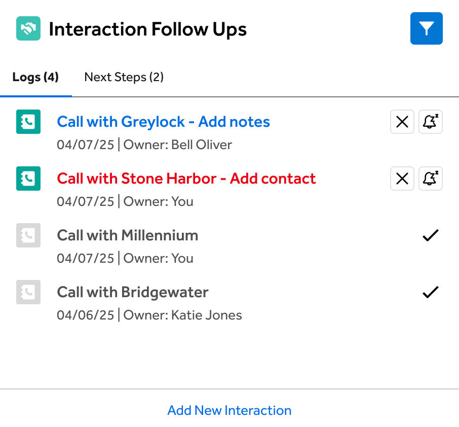 Dynamic task list auto-generated based on inactivity, surfacing who to call or meet next.