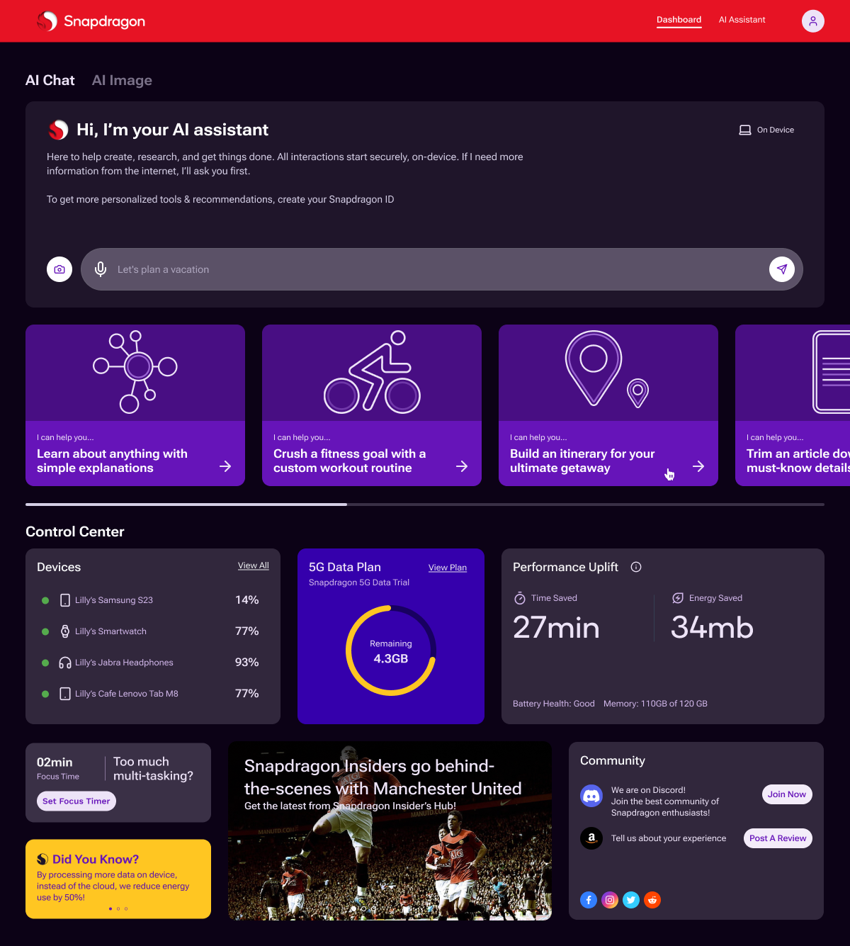 As Director of UX and Product Design, I led the creation of Snapdragon’s Compute App, a central hub for AI tools and connected peripherals on Qualcomm-powered laptops. This work set the foundation for future AI products, mobile data services, and an extended device ecosystem. The prototype debuted at the Snapdragon Summit 2023, live on stage with CEO Cristiano Amon.