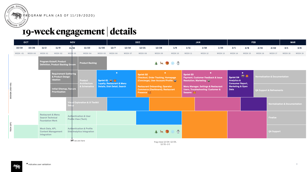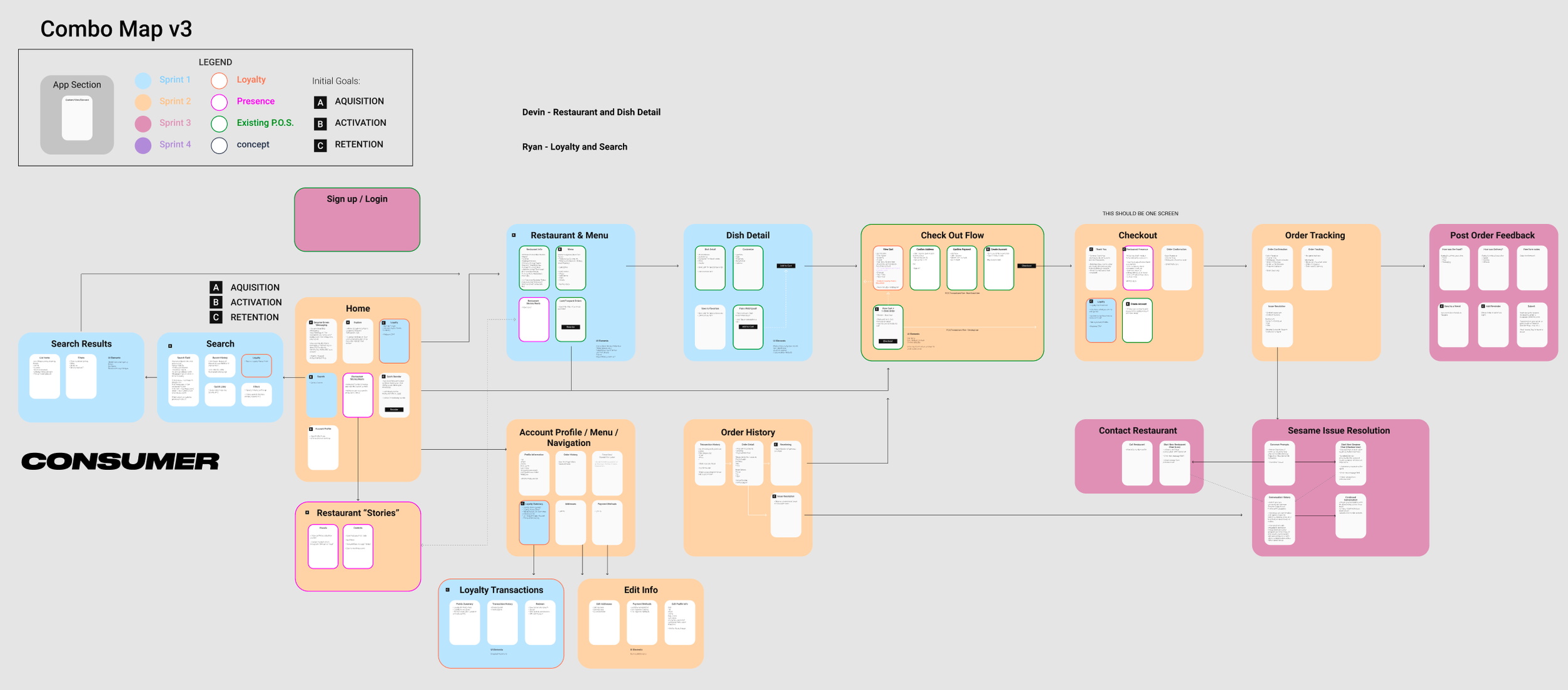 This diagram served to outline the various screens and components to be designed, as well as the Sprint cadence and dependencies of elements within.