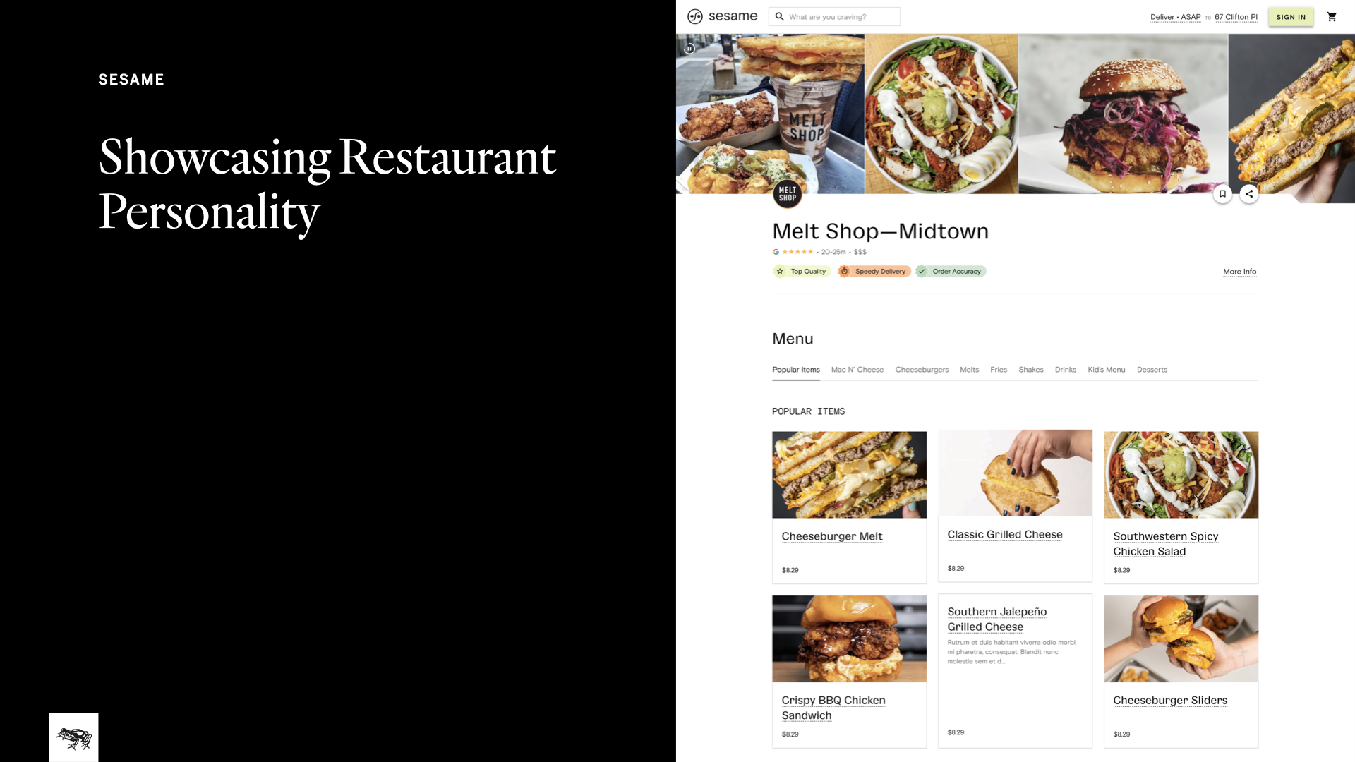 Needed a food delivery experience centered on fairness for restaurants and better engagement for diners. → Designed customer and restaurant tools that reflected Sesame’s mission of equity and sustainability.