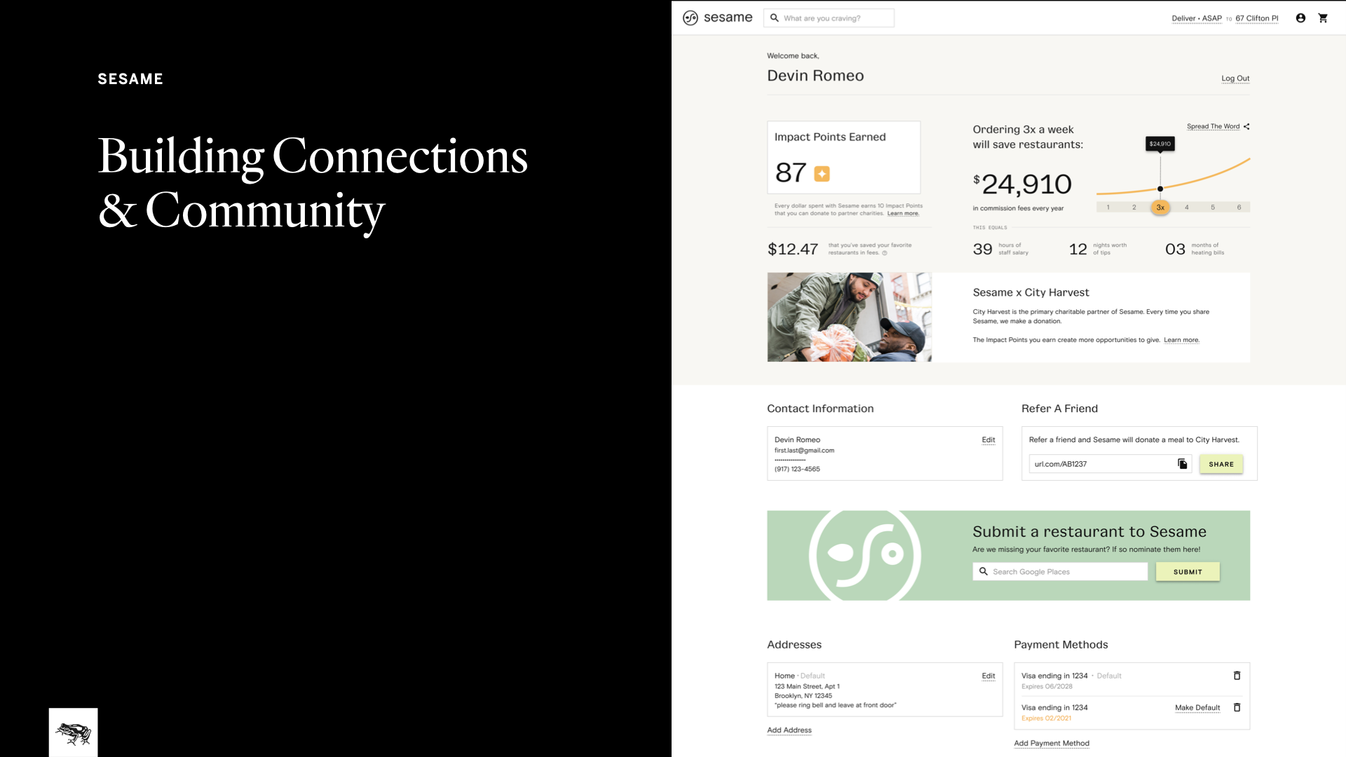 Building altruism into the flywheel: Developed loyalty program that reflects the positive impact the customer has on the community by using Sesame over other delivery services.